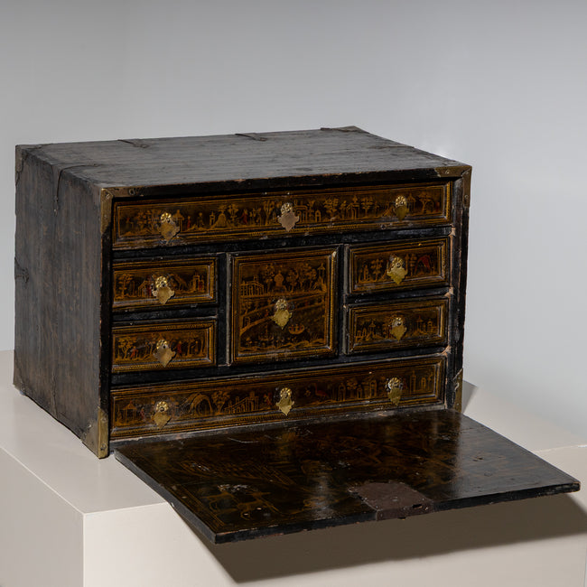 Kleines Kabinett aus Holz, schwarz lackiert und vergoldet, mit Frontklappe. Die Inneneinteilung besteht aus sieben Schubladen mit kleinen, blattförmigen Eisengriffen.