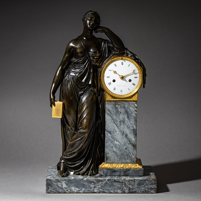 Pendule aus grauem Marmor mit vollfiguriger weiblicher Figur, wohl der Muse Clio, in Bronze. Das von ihr gehaltene Buch ist vergoldet; in nachdenklicher Haltung lehnt sie an das Uhrengehäuse.