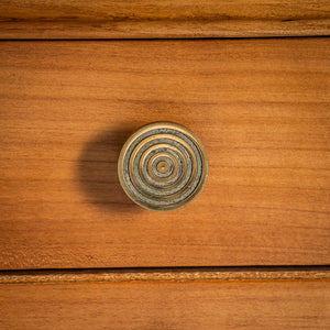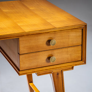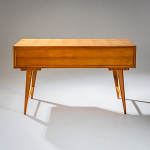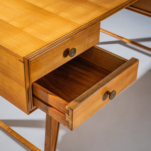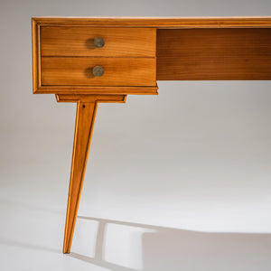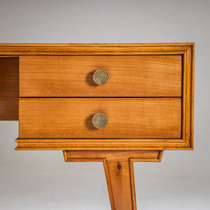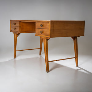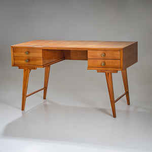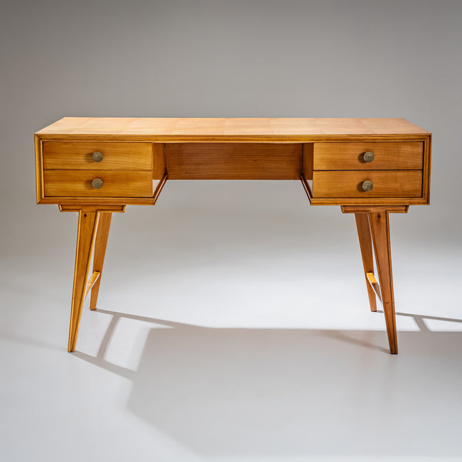 Schreibtisch im Mid-Century-Stil, gefertigt aus hellem Holz mit klarer Linienführung und leicht ausgestellten, konischen Beinen. Der Tisch verfügt über vier Schubladen mit runden Messinggriffen und einer angenehm proportionierten Arbeitsfläche.