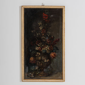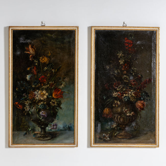 Paar Stillleben mit Blumenvasen im Barockstil. Die in die Vertikale wachsenden Blumenbouquets zeigen ein wunderbares Arrangement verschiedenster bunter Blüten.