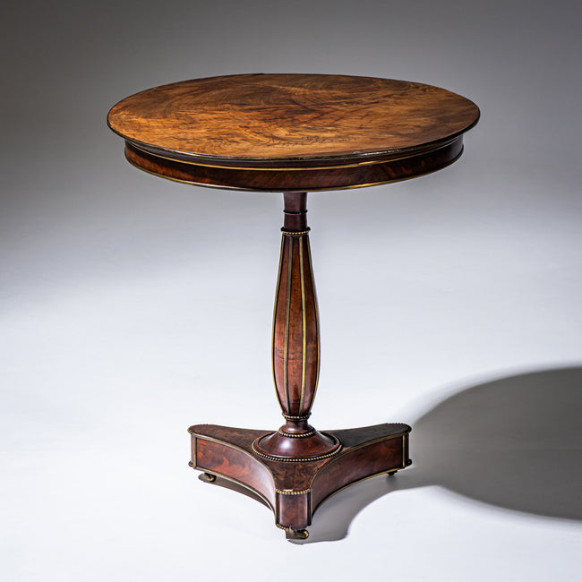 Beistelltisch mit runder Tischplatte und dreipassigem Standfuß. Der Tisch steht auf einem konisch gebauchten Säulenfuß, der mit Messingprofilen und Perlstäben dekoriert ist.