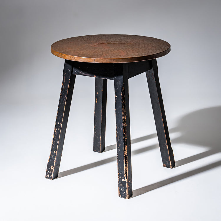 Kleiner Tisch beziehungsweise Hocker mit vier schwarz gestrichenen Beinen und runder Platte mit gehämmerter Kupferoberfläche. Die lebendige Struktur des Kupfers verleiht dem Stück eine handwerkliche Ausstrahlung.