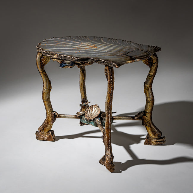 Der Tisch ruht auf vier Beinen in Form stilisierter Delphine. Eine X-förmige Verstrebung verbindet die Beine und zeigt im Zentrum eine plastisch ausgearbeitete Unterwasserlandschaft mit Muscheldekoren.